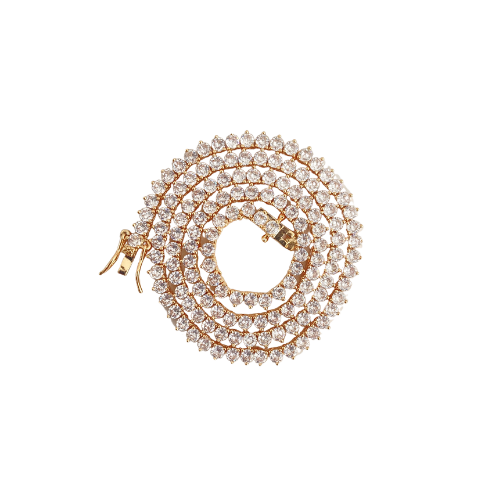 O colar Riviera é uma peça de joalheria clássica e elegante, caracterizada por uma fileira contínua de zircônias medindo de 2 a 6mm de tamanho, meticulosamente alinhadas e engatadas de forma delicada, com três pontas que garante que o colar deite perfeitamente no pescoço e não gire durante o uso, criando uma aparência homogênea e cintilante.